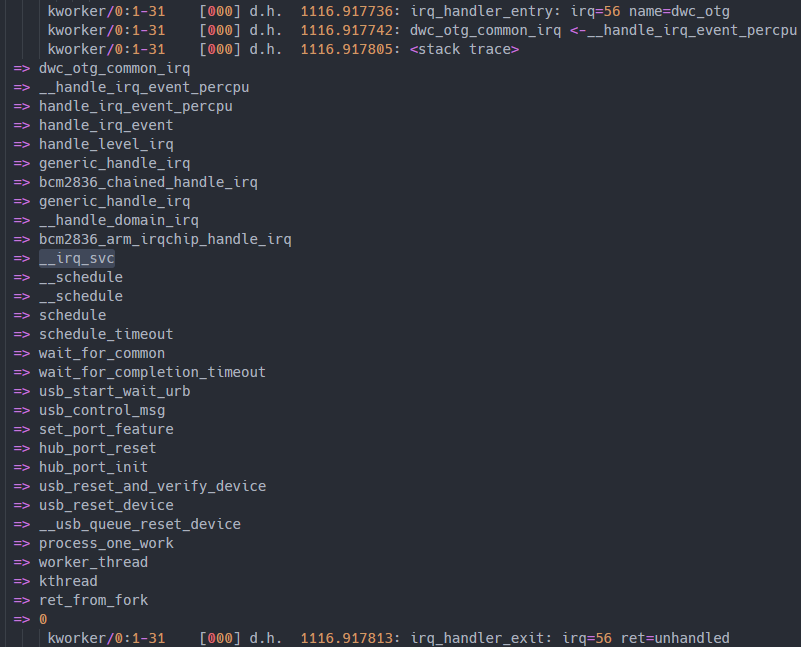 실습을 위해 ftrace 켜놓고 USB 연결해서 다음과 같은 로그를 얻었다. 책과는 좀 다르지만 여기서 인터럽트가 발생한 지점은 바로 __irq_svc 부분이다. 스케줄링 돌다가 인터럽트 처리한 것으로 보인다.