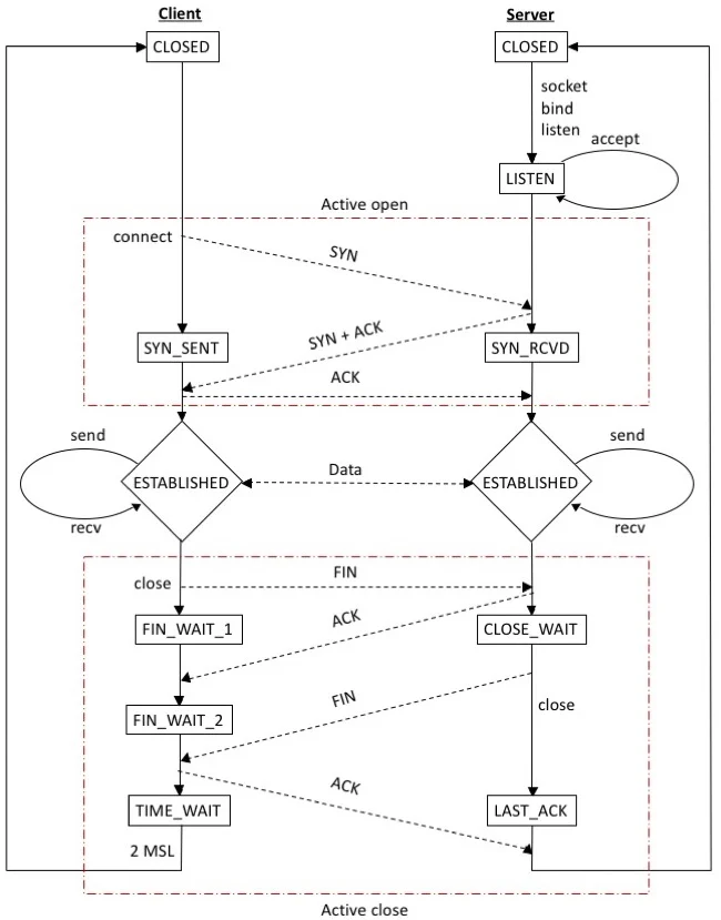 위의 도식에서 TCP를 기준으로 사용된 시스템 콜들과 시간대별로 설정되는 state들을 확인할 수 있다.