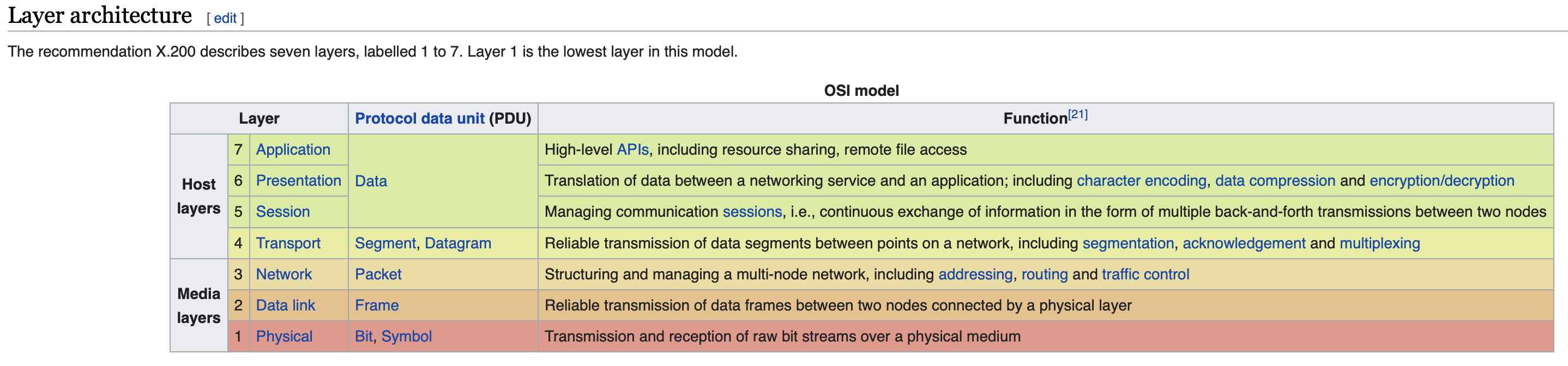 낮은 계층부터 높은 계층까지 순서대로 Physical, Data Link, Network, Transport, Session, Presentation, Application Layer다. 각 계층에 대한 설명은 위키피디아에서 보는 것으로 대체한다.