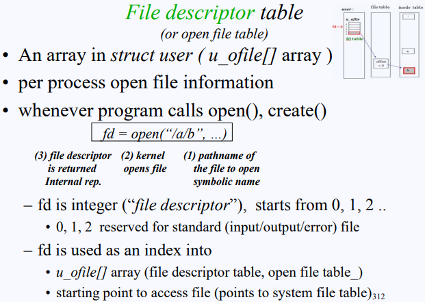 PCB 내에 존재하면서 fd table의 역할을 하는 이 array가 바로 u_ofile[] array다. 그리고 각 프로세스마다 갖고 있는 정보다. fd는 open() 이후 받는 리턴 값이다.
