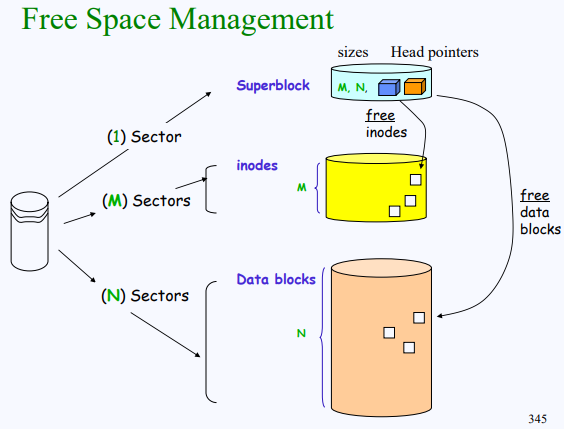 이 head pointer들은 supber block이 가지고 있다. 이렇게 해서 super block은 inode block과 data block의 크기인 M, N과 각 free spaces의 linked list를 가리키고 있는 head pointers를 가지고 있다.