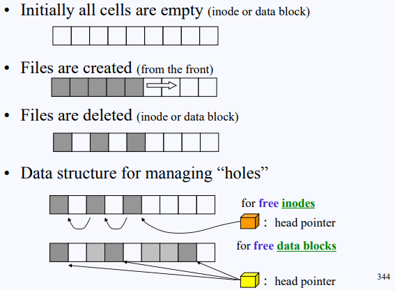두 block의 구분 없이 같은 cell의 입장에서 살펴보자. file이 생성되어 계속 채워지다가 중간중간 지워지는 일도 생길 것이다. 중간에 없어진 hole들은 알아뒀다가 나중에 사용해야 공간에 낭비가 없다. 그래서 free space를 관리하기 위해 free space들을 linked list 형태로 구현해서 head pointer로 가리키고 있어야 한다. inode, data block 각각 해서 두 개를 가지고 있어야 한다.