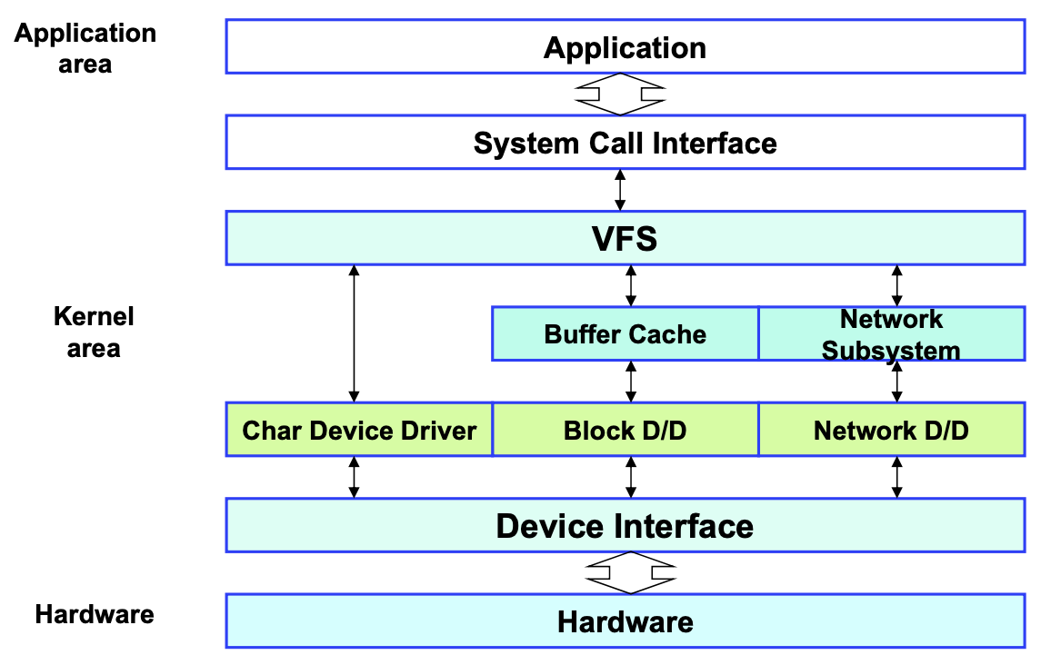 Linux Device Driver의 구조는 위의 그림과 같이 계층 구조로 이루어져 있다. 맨 아래 하드웨어, 맨 위에 응용 프로그램이 위치하고 중간에 커널이 이를 중개하고 있다. 디바이스 드라이버의 종류로는 크게 character device driver, block device driver, nerwork device driver가 있다. 위로는 VFS(Vritual File System)이 여러 종류의 FS에 대한 공통된 인터페이스를 제공하기 위해 리눅스에서 생긴 개념이다. 디바이스 드라이버도 하나의 파일이라고 했으므로 VFS의 인터페이스에 따라 디바이스 드라이버가 작성되어야 할 것이다.