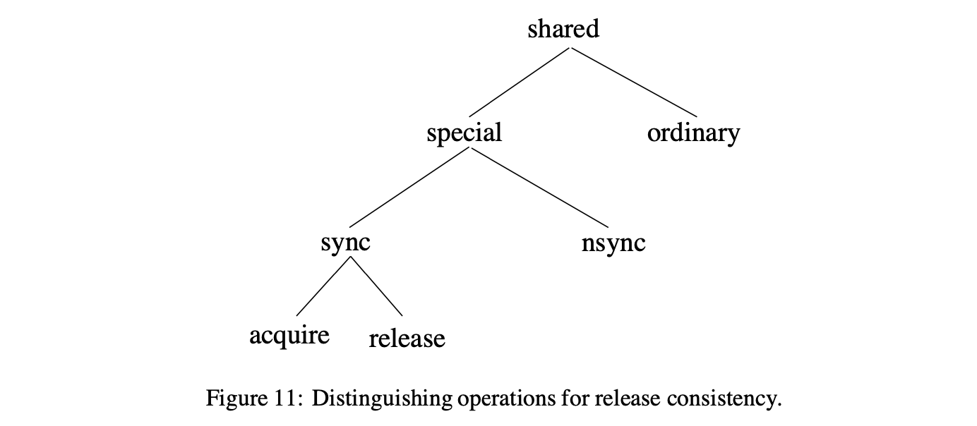 약한 순서 모델과 비교하자면, 일관성 완화(release consistency)는 메모리 오퍼레이션 사이의 거리 또한 제공한다. Figure 11은 이러한 메모리 오퍼레이션의 분류를 그림을 넣어 보여준다. 오퍼레이션은 먼저 평범함(ordinary) 또는 특별함(special)으로 구분된다. 이 두 카테고리는 WO의 데이터 및 동기화와 약하게 일치한다. 특별한 오퍼레이션은 동기(sync) 또는 비동기(nsync) 오퍼레이션으로 다시 구분된다. 동기(sync)는 직관적으로 동기화 오퍼레이션과 일치하는 반면에, 비동기(nsync)는 동기화에서 사용하지 않는 비동기 데이터 오퍼레이션 또는 특별한 오퍼레이션과 일치한다. 마지막으로, 동기 오퍼레이션은 습득(acquire) 또는 완화(release) 오퍼레이션으로 다시 구분된다. 직관적으로, acquire은 공유된 위치의 집합으로의 접근 권한 얻기를 수행하는 읽기 오퍼레이션이다 (e.g., lock 오퍼레이션 또는 flag를 세팅하기 위한 spinning). Release는 공유된 위치의 집합으로의 접근을 위한 권한을 승인받기 위해 수행되는 쓰기 오퍼레이션이다 (e.g., unlock 오퍼레이션 또는 flag 설정하기).