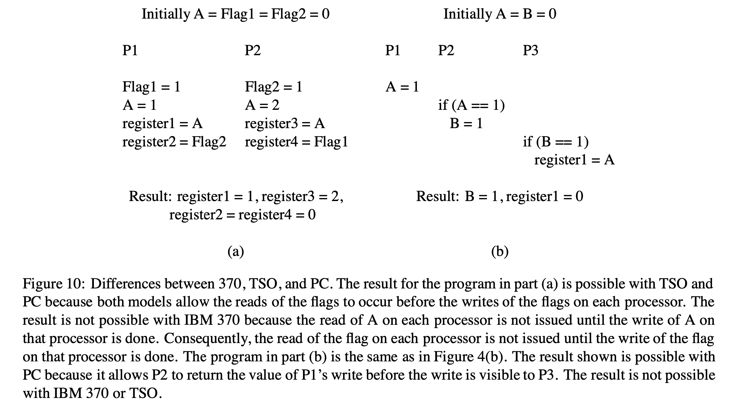 세 가지 모델은 언제 읽기가 쓰기 값을 반환할 수 있는지에 따라 차이가 있다. IBM 370 model은 가장 엄격한데 왜냐하면 모든 프로세서에서 쓰기가 보이기 전에는 쓰기 값을 반환하는 것을 읽는 것이 금지되기 때문이다. 그러므로, 프로세서가 이전에 보류한 쓰기 주소와 동일한 주소로의 읽기를 실행한 경우일지라도, 읽기는 모든 프로세서로부터 쓰기가 보일 때까지 미뤄져야만 한다. TSO model은 같은 장소에서의 다른 쓰기 관점에서 쓰기가 직렬화되기 전일지라도 읽기가 자신의 프로세서의 쓰기 값을 반환할 수 있도록 함으로써 위의 요구 사항을 부분적으로 완화한다. 하지만, sequential consistency 관점에서 보면, 다른 모든 프로세서에게 보일 때까지 읽기는 다른 프로세서의 쓰기 값을 반환할 수 없다. 마지막으로, PC model은 쓰기가 직렬화되거나 다른 프로세서에게 보이기 전에 읽기는 모든 쓰기 값을 반환할 수 있다는 것과 같은 제약 조건들을 완화한다. Figure 10은 위의 세 가지 모델 사이의 이러한 차이점들을 보여주는 예시 프로그램을 나타낸다.