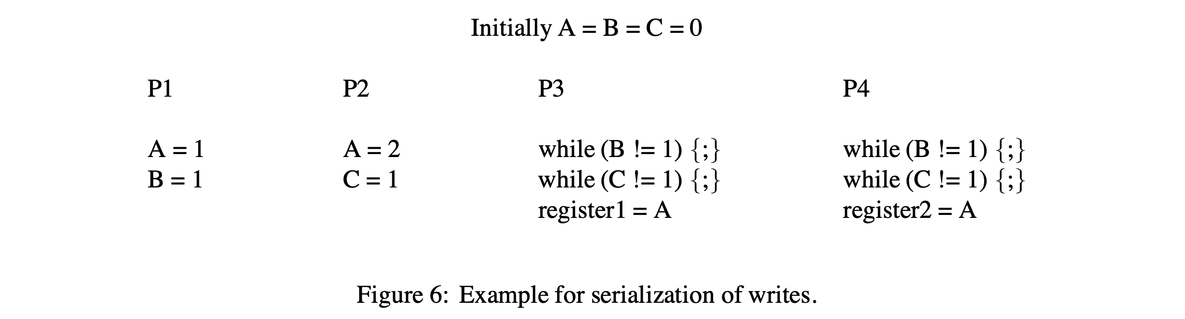 첫 번째 조건에 동기를 부여하기 위해 Figure 6에 나타나는 예제를 고려해보자. 모든 프로세서들은 프로그램 순서에 따라, 그리고 한 번에 하나씩 메모리 오퍼레이션을 실행한다고 가정한다. 만약 프로세서 P1, P2에 의해 A로의 쓰기를 위한 업데이트가 프로세서 P3, P4에 다른 순서로 도달한다면, sequential consistency를 위반할 가능성이 있다. 그러므로, 프로세서 P3, P4는 A에 쓰기가 비 원자적인 것처럼 보이게 만들면서 각각의 A 읽기가 다른 값을 반환할 수 있다 (예를 들어, register1과 register2가 1과 2라는 값을 각자 할당받을 수 있다). Sequential consistency의 위와 같은 위반은 메시지들이 네트워크 내에서 다른 경로를 통해 여행하고 도착 순서에 대해 아무런 보장이 없는 (Figure 5(b) 예시와 같이) 일반적인 상호 연결 네트워크를 사용하는 시스템에서 가능하다. 이 위반은 동일한 위치에 쓰기가 직렬화되도록 하는 조건을 부여하면 피할 수 있다; 예로써 모든 프로세서가 같은 위치에서의 쓰기는 같은 순서로 보인다. 이러한 직렬화는 주어진 위치에서의 모든 업데이트나 무효화가 한 곳(예시. 디렉터리)에서부터 유래하고 주어진 source와 destination 간의 그러한 메시지들의 순서가 네트워크에 의해 보존된다면 저장될 수 있다. 하나의 대안은 동일한 위치의 이전 쓰기를 대표해서 발생된 어떠한 업데이트나 무효화가 승인될 때까지 업데이트나 무효화를 지연하는 것이다 (간단히 정리하자면, 현재의 쓰기로 인해 발생한 업데이트 또는 무효화 메시지를 이전에 발생한 쓰기 때문에 발생한 업데이트 또는 무효화 메시지가 모두 승인되어 없어질 때까지 기다렸다가 적용시키자는 것이다).