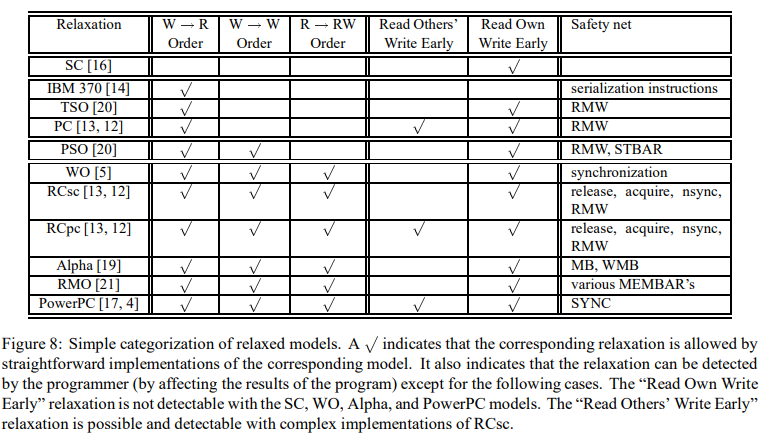 Figure 8은 이 섹션의 남은 부분을 설명하는 모델들의 개요를 제공한다. 이 figure는 단순한 모델의 구현이 프로그램 순서 또는 위에서 설명한 쓰기 원자성 완화를 효율적으로 이용할 수 있는지 아닌지에 대해 보여주고, 각 모델로부터 제공되는 안전망을 언급한다. 이 figure는 언제 프로그래머가 위의 완화들을 발견할 수 있는지 또한 알려준다; i.e., 프로그래머가 프로그램 결과에 영향을 줄 수 있을 때. Figure 9는 위의 완화를 허용하는 상업 시스템의 예시를 보여준다. 간단히 하자면, 우리는 명령어 패치 또는 다중 세분화(granularity) 오퍼레이션(e.g., byte, word 오퍼레이션)과 같은 문제와 관련된 모델의 시멘틱을 설명하려 하지 않는다; 몇몇 이러한 모델에서 정의되는 그런 시멘틱일지라도.