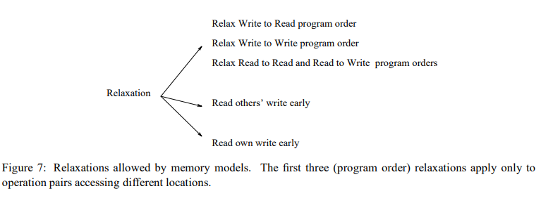 Sequential consistency의 대체제로서 몇몇 relaxed memory consistency model은 학술적이고 상업적인 환경 안에서 제안되었다. 이러한 모델의 대부분의 원래 설명은 매우 다양한 사양 방법론과 형식주의 수준에 기초하고 있다. 이번 섹션의 목표는 이런 모델들을 간단하고 통일된 용어를 사용해서 묘사할 것이다. 이러한 모델들의 원래 사양은 모델에 의해 가능한 시스템 최적화를 강조한다; 이번 섹션의 설명에서는 시스템 중심의 강조점을 유지한다(retain). 하드웨어 공유 메모리 시스템을 위해 제안된 모델에 집중한다; 소프트웨어로 지원하는 공유 메모리 시스템을 위해 제안된 relaxed model은 설명하기 더 복잡하고 이 논문의 범위를 벗어난다. 프레임워크 내 몇몇 모델의 공식 설명과 함께, 하드웨어 및 소프트웨어 기반 모델을 설명하기 위한 보다 공적이고 단일화된 시스템 중심의 프레임워크는 이전에 다뤘다 [8, 6].