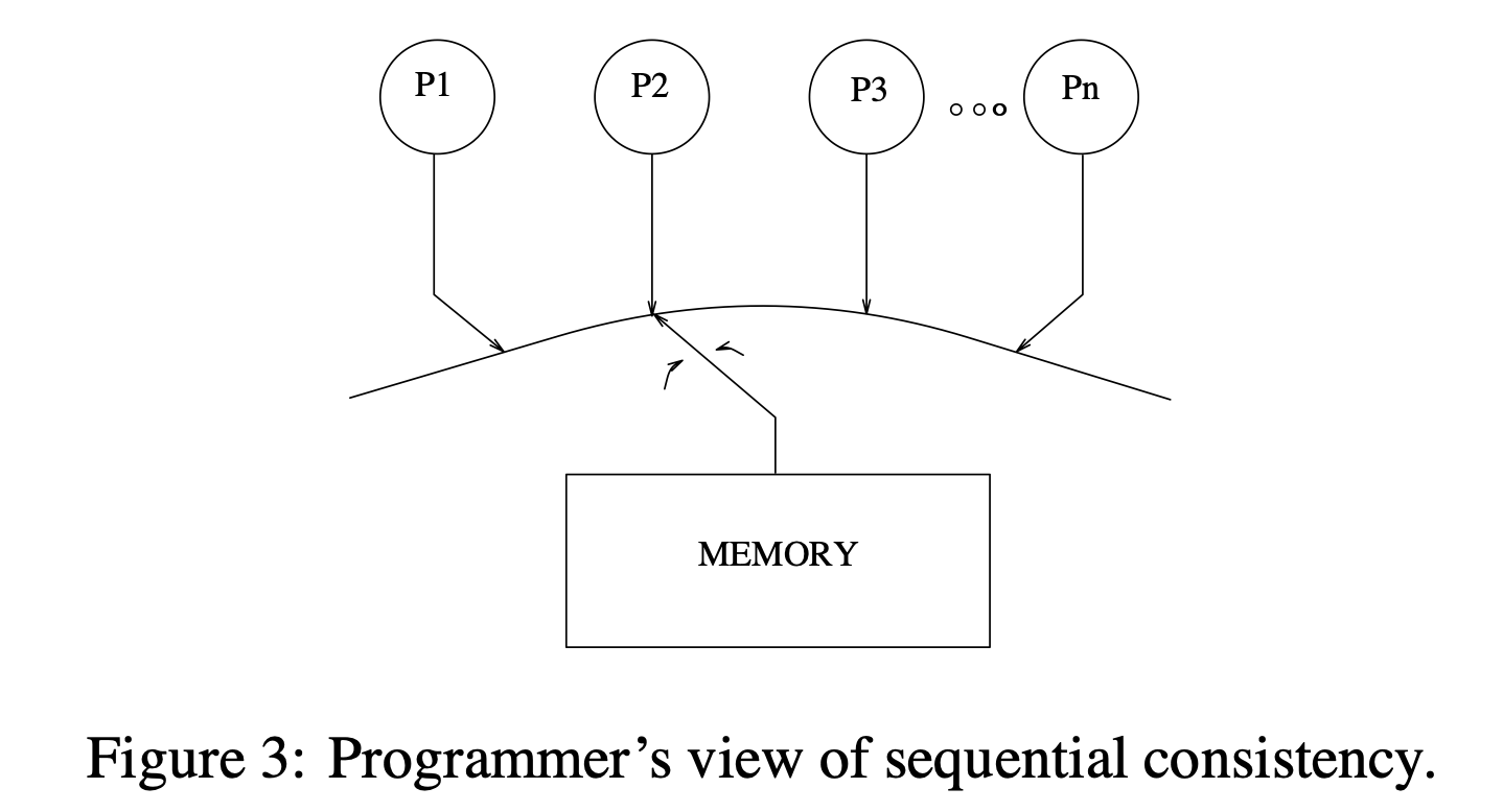 Sequential consistency는 Figure 3에 나타난 것처럼 프로그래머에게 시스템에 대한 간단한 시각을 제공한다. 개념적으로는 하나의 글로벌 메모리와 각 타임 스텝에서 임의의 프로세서에게 메모리를 연결하는 스위치가 존재한다. 각 프로세서는 프로그램 순서대로 메모리 연산을 수행하고 스위치는 모든 메모리 연산 사이의 전역 직렬화(global serialization)를 제공한다.